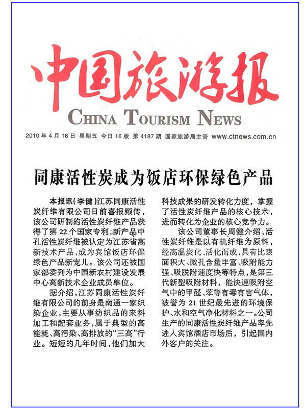 中國旅游報——同康活性碳成為飯店環(huán)保綠色產品