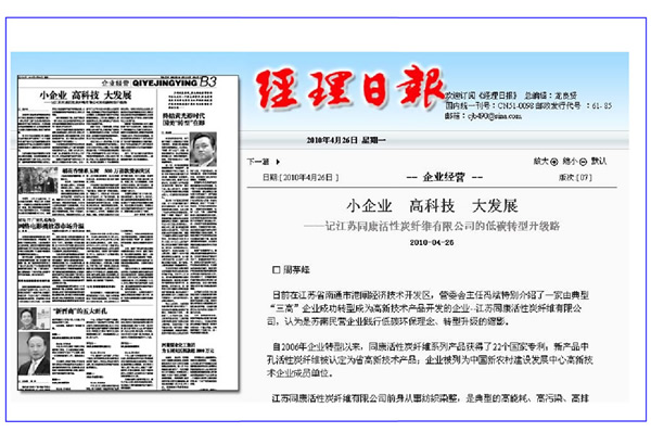 經(jīng)理日報——小企業(yè)、高科技、大發(fā)展“記江蘇同康活性碳纖維有限公司的低碳轉(zhuǎn)型升級路”